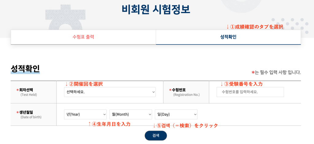 受験回、受験番号、生年月日を入力し、검색(検索)を押す