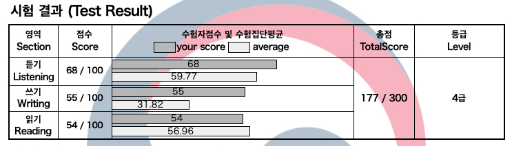 2年半韓国語学習を継続した結果は4級合格でした。各科目の点数は、リスニング68/100、ライティング55/100、リーディング54/100で、合計は177/300でした。
