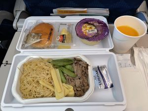 定刻に無事離陸。帰りの便の機内食は麺料理でした。