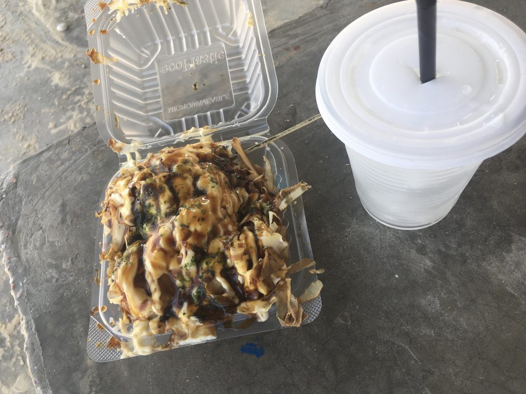 フィッシャーマンビレッジの海沿いを歩いていると、小さな屋台になんとTAKOYAKIの文字が。